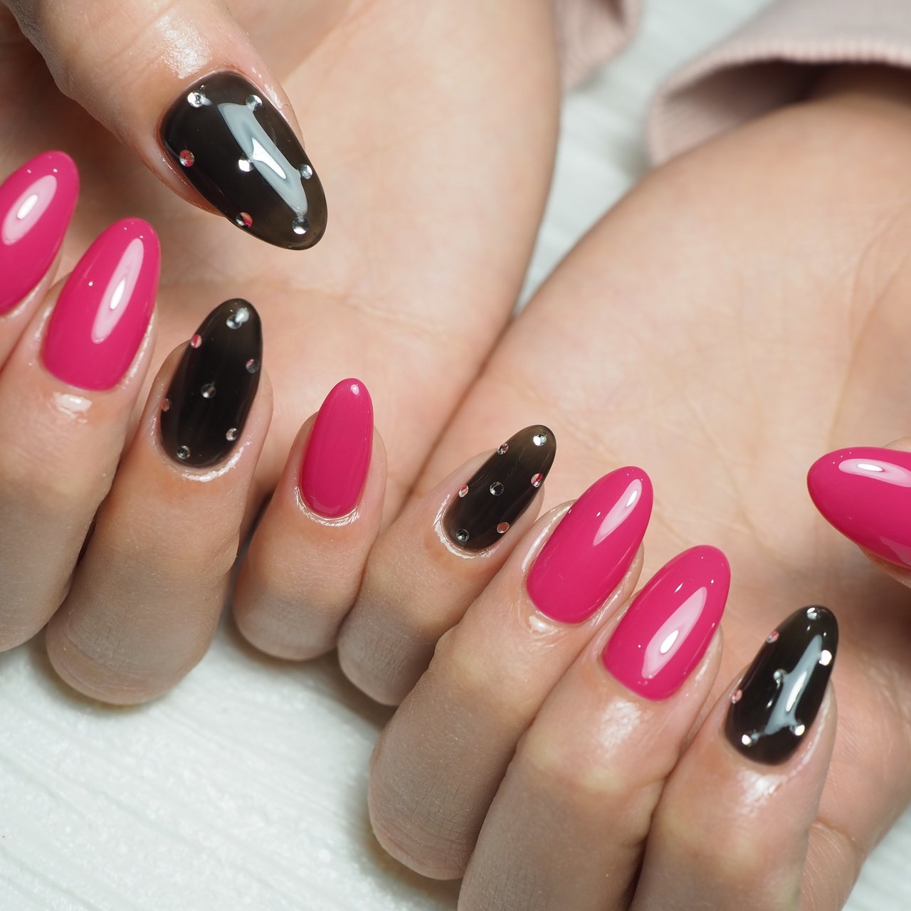ショッキングピンクとブラックの大人ネイル ネイルサロン Lima